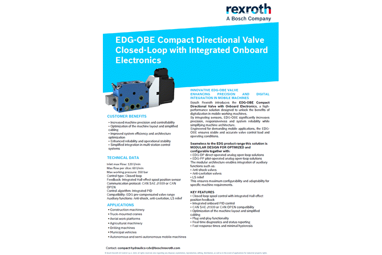 A one-page overview detailing features and benefits of the EDG compact directional valve with on-board electronics.